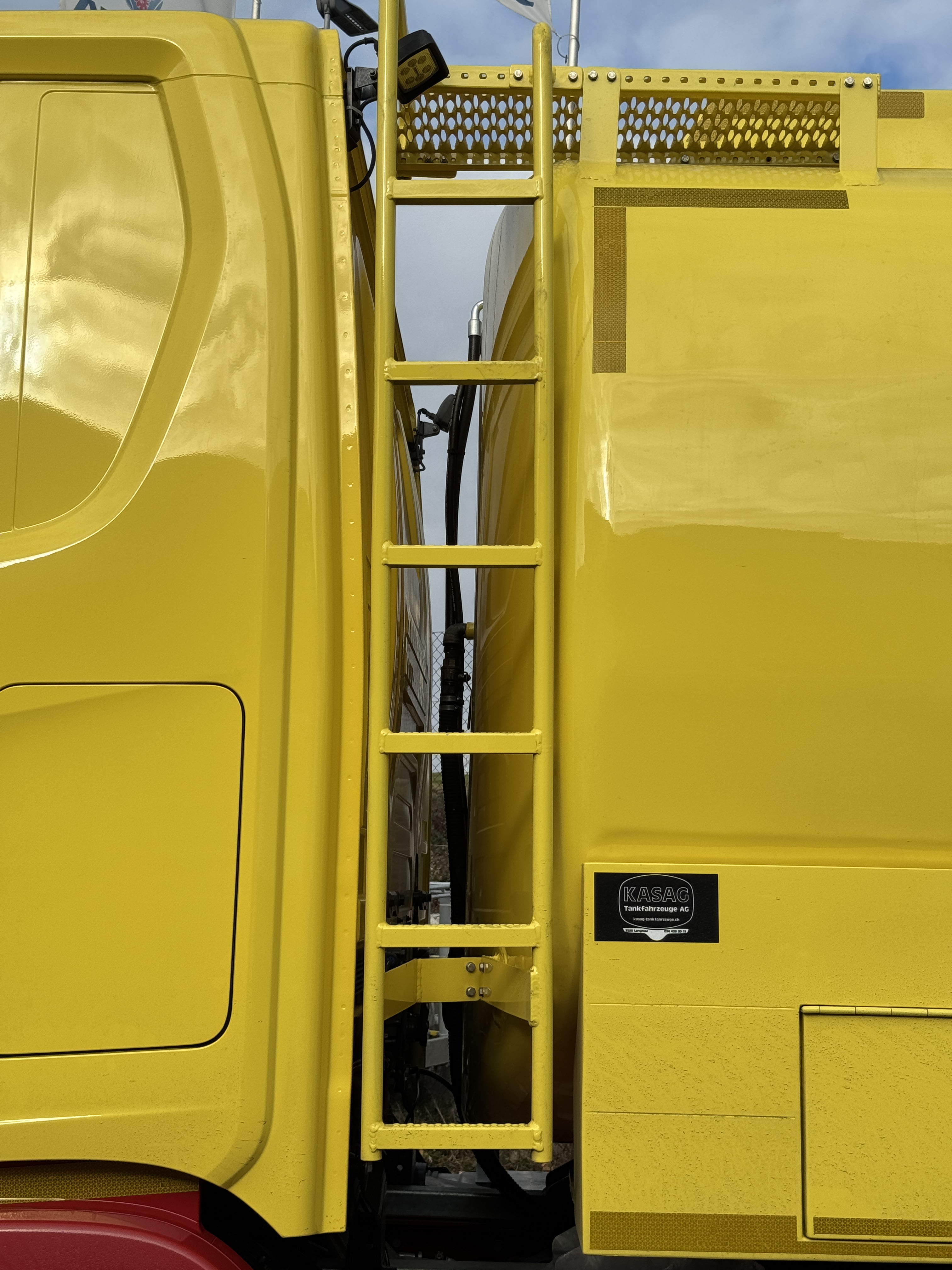 Der rund 33’500 Liter fassende Tankaufbau aus dem Jahr 2014 wurde vom Vorgänger-Fahrzeug demontiert und durch die Firma KASAG Tankfahrzeuge AG in Langnau komplett überholt, neu lackiert auf das neue Scania Fahrgestell aufgebaut. Dabei konnte der Aufbau weiter nach vorne gebaut werden, was den neuen Fünfachser rund 10 cm kürzer werden liess. Neben dem Ersatz aller Verschleissteile wurde auch die gesamte Elektronik den neuesten Vorschriften angepasst und optimiert. Der Aufbau verfügt auch nach der kompletten Revision über insgesamt drei Kammern mit je einem Fassungsvermögen von 13’000, 5’500 und 15’000 Liter und kann im Pumpen- oder Freifallbetrieb entladen werden, wofür auch zwei unterschiedliche Messzähler verbaut sind.