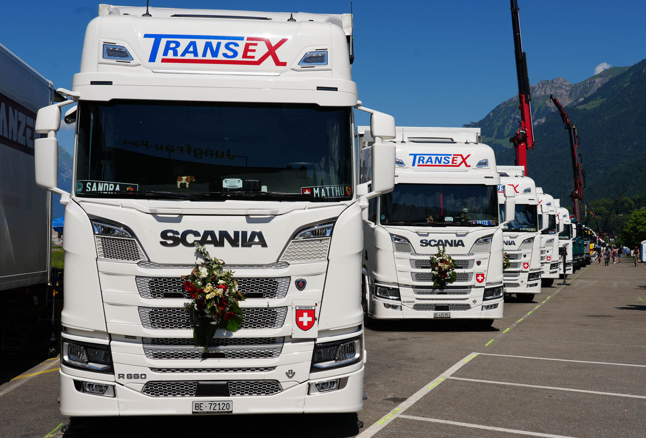 Le parc roulant compte actuellement 24 véhicules utilitaires lourds, tous peints en blanc et arborant le célèbre logo TRANSEX en bleu et rouge. Une grande attention est accordée à cet aspect, car les véhicules propres et bien entretenus sont la carte de visite d'une entreprise. De plus, chaque véhicule arbore les armoiries suisses à l'avant, qui reflètent l'attachement et la fierté envers le pays d'origine lors des trajets à travers les pays voisins et en Scandinavie. Sur les 24 véhicules utilitaires, 16 portent le logo SCANIA à l'avant, ce qui témoigne de l'étroite relation et du partenariat de longue date avec le constructeur suédois de véhicules utilitaires. TRANSEX BERN AG a acheté son premier Scania le 24 novembre 1967. Le Scania LB110 Super 50, avec le numéro de châssis 437.430 et le numéro interne Scania 1355, a été mis en service le 8 avril 1968.