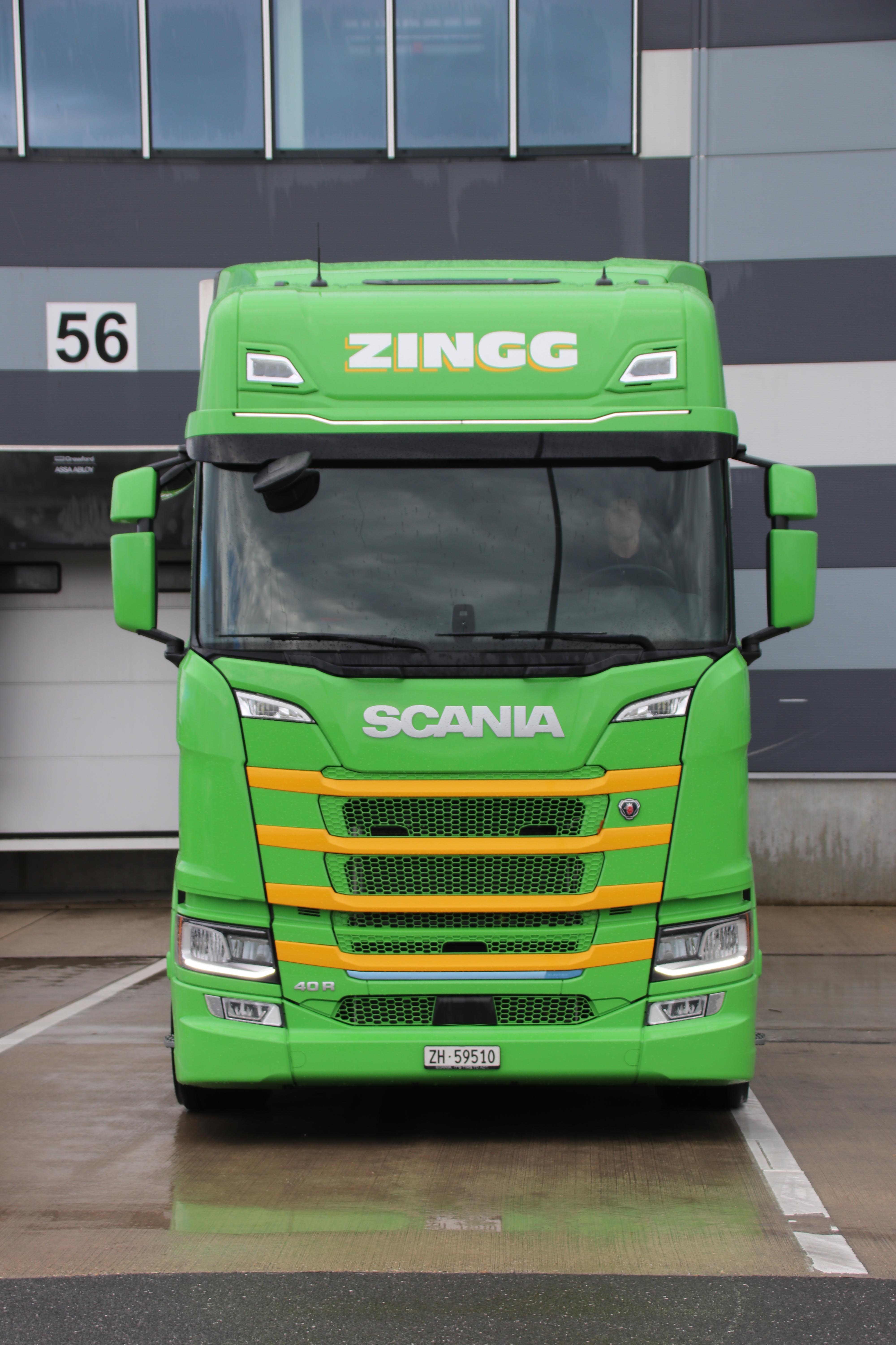Au total, quatre véhicules utilitaires lourds neutres en CO2 font partie de la flotte moderne de désormais 142 véhicules utilitaires lourds de Zingg Transporte AG. En 2021, un premier camion remorque à hydrogène a rejoint le parc roulant et, l'année dernière, on a ajouté un premier tracteur routier 4x2 et un véhicule solo 6x2*4 de Volvo. Avec la mise en service du premier tracteur routier Scania BEV, un nouveau véhicule utilitaire lourd est venu compléter la flotte et remplace en gros un tracteur routier conventionnel. Grâce à son autonomie élevée, le Scania 40R A 4x2 NB peut être utilisé pour des tournées de livraison dans toute la Suisse, ce qui simplifie considérablement la planification.