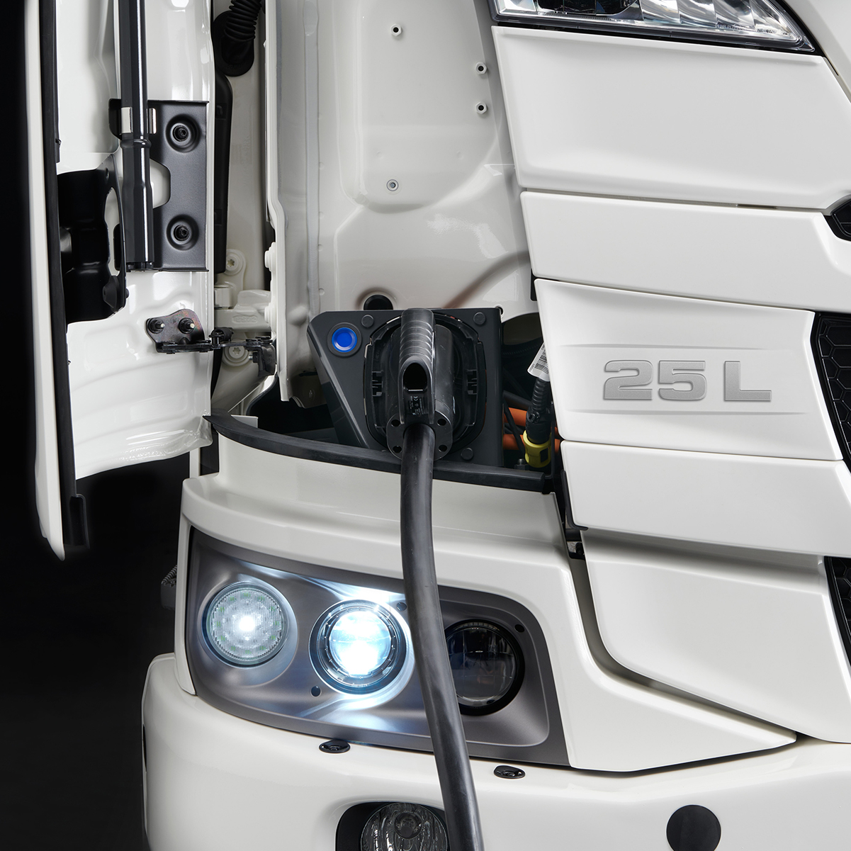 La cadena cinemática eléctrica brinda una potencia considerable y torque instantáneo. La toma de fuerza totalmente eléctrica permite obtener un funcionamiento continuo sin emisiones en las unidades hidráulicas y de refrigeración. Con un alcance desde 370 a 560 km en una sola carga, puede abarcar rutas cortas y medias, solo con energía eléctrica.