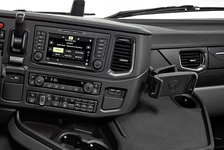 Hold nemt overblikket over dagens opgaver med en tabletholder, der er monteret direkte i instrumentpanelet. Tabletholderen består af en leddelt støttearm og en holder, som kan vippes op og ned og drejes 360° for at opnå den optimale placering af tableten.