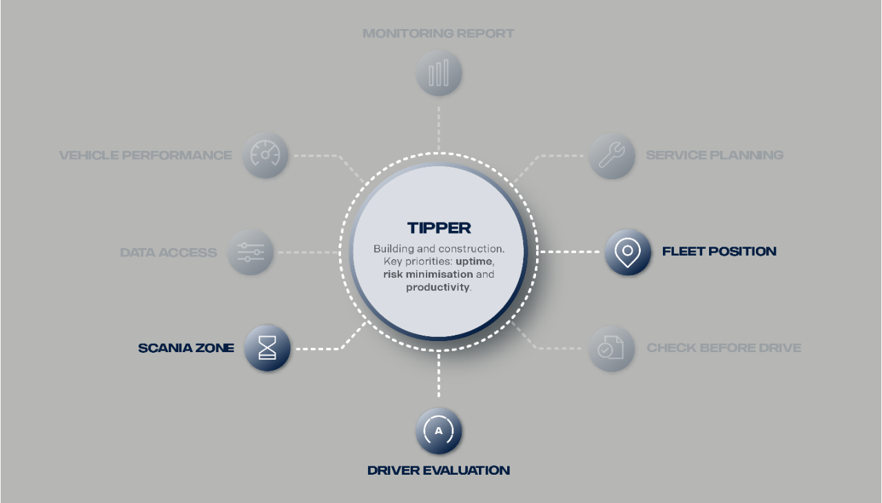 For tipper operations, uptime, productivity and risk minimisation are key priorities. With the help of the collection of services in Control Package, transport companies in the construction business can fulfil their customers’ expectations as well as deliver on other specific priorities. Here are some examples: