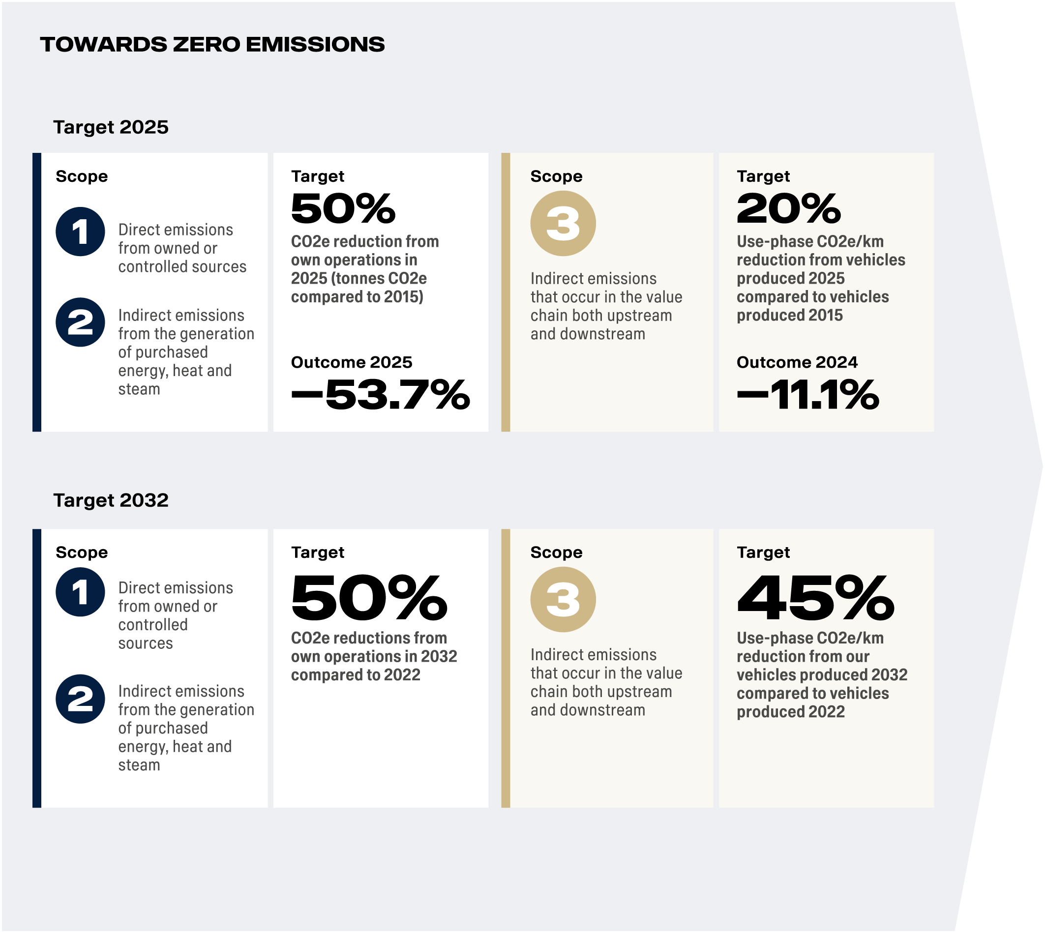 By 2025, our aim was to reduce emissions from our operations by 50 percent and the emission intensity of vehicles sold by 20 percent, compared to 2015. While we reached the target for our own operations, we need to accelerate the reduction of emissions from vehicles sold, where most emissions occur.