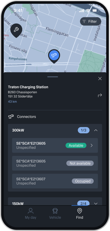 Scania Driver connects driver to both vehicle and office. With the help of the app, the driver can set a comfortable temperature in the cab, keep track of driving times and see the status of your vehicle.
