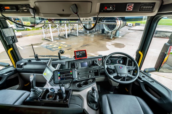 "The appliances are all fitted with a 500 horsepower Scania engine, which provides all the power we need. Drive is by way of Allison automatic gearboxes which deliver the power in a smooth and controlled fashion as the vehicle accelerates, which is another key safety factor. The 6x6 chassis are all-wheel-drive with high floatation tyres fitted. This offers us the ability to take the shortest possible route to any incident, which as you can imagine at an airport could well include travelling off-road over grass."